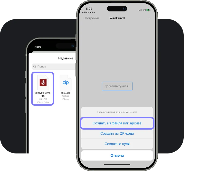 Нажмите на + в правом верхнем углу, затем выберите «создать из файла». В открывшемся окне выберите файл vpntype. Разрешите приложению добавить конфигурацию.